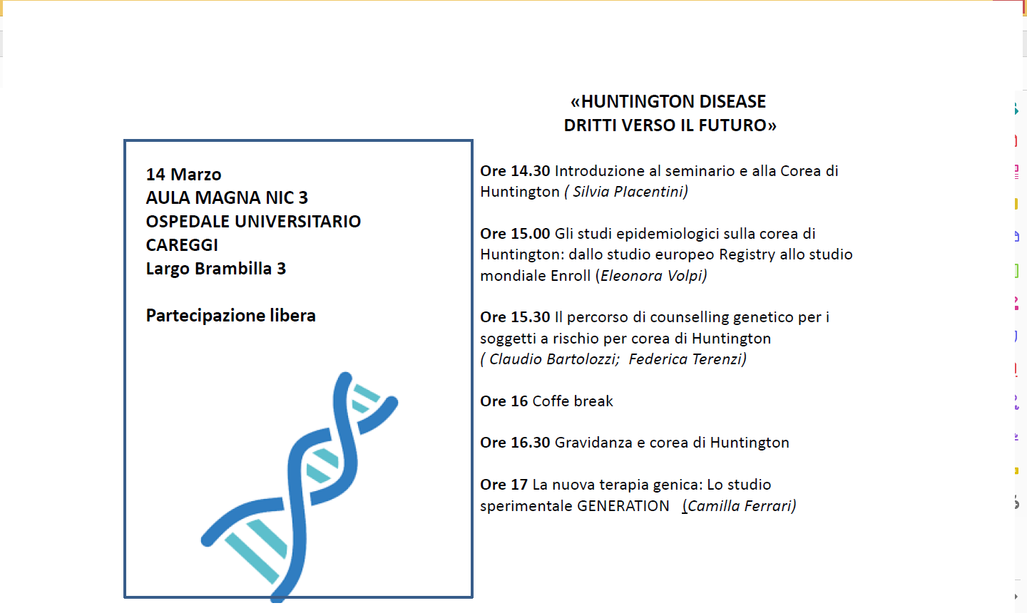 Il prossimo 14 marzo si terrà a Firenze presso l'Aula Magna NIC 3, AOU Careggi (L.go Brambilla, 3), il workshop dal titolo "Huntington disease, dritti verso il futuro".